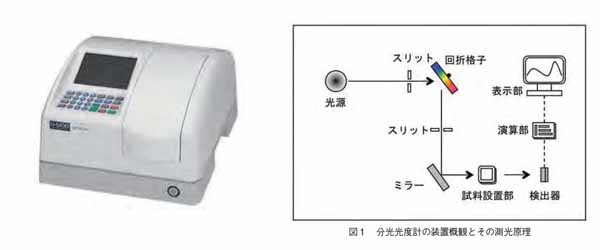分光光度法とは、分光光度計を用いて特定の波長の光の強度、すなわち光の吸光度を測定する方法であります。